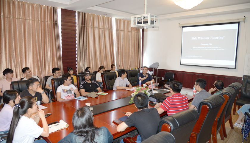 做了主题为《Side Window Filtering》的学术报告。会议开始由韩慧健院长介绍了邱教授的学术成就并发表了欢迎致辞,表达了对邱教授的热烈欢迎。部分老师以及全体研究生参加了本次学术报告。邱国平教授首先详细介绍了其团队发表于CVPR 2019的相关研究工作,之后还介绍了最近正在进行的其它相关研究,包括基于生成对抗网络(GAN)的图像去雾、基于深度学习的图像压缩、视觉显著性检测和HDR色调映射等。整场报告观点新颖、内容丰富,在场的所有师生认真聆听了本次学术报告,对滑动窗口的相关知识有了一个全新的认识,为之后的学术科研开拓了新的道路。最后邱国平教授与在座的老师同学进行了交流讨论,仔细地解答了师生们提问的问题,充分达到了开展此次学术报告的目的。