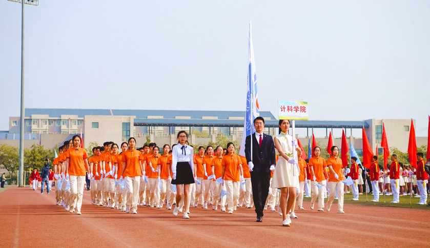 方阵队由48人组成,他们身着橙色运动服,手持院旗,伴着整齐的手势、划一的步伐昂首挺胸地走过主席台。