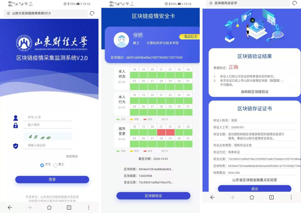 系统采用云计算、区块链技术实现了精准到人、师生员工100%覆盖,并可根据疫情动态即时调整采集数据类型,第一时间掌握疫情态势,实现实时在线监测防控的目标。目前师生填报率已达100%,实现了教育部“全面摸清、准确掌握学生所在地区、健康状况等信息。主动联系每一位学生,随时沟通情况”的要求。系统采用区块链数据自主开发的疫情安全卡,包含了山东健康通行卡的指标信息,能一次提供14天的可视化健康记录,用颜色给出安全、预警、危险等提示,并提供验证和区块链存证证书,解决了师生需要一次隔离14天的时间难题。