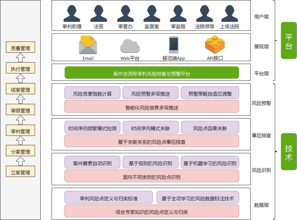 本系统面向案件审判全流程,支持对立案、审判到执行案件全流程的风险点建立事前、事中、事后的全方位风险排查与预警,包含分案管理、排期管理、审限管理、结案管理、质量管理等七个阶段的风险点,覆盖立案身份信息采集不全、立案超出期限、裁判文书送达超出期限等至少200个风险点。