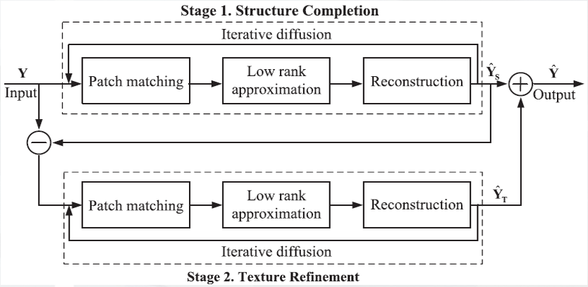 本文提出了一种高效的截断低秩近似策略以实现对待修补图像进行估计。利用图像内在的冗余信息构建相似图像块矩阵,通过矩阵的最优低秩近似理论直接导出缺失像素的估计值。同时,为了细化图像的纹理结构,利用残差图像和纹理结构小尺度的特点,进一步对其进行最优低秩近似。